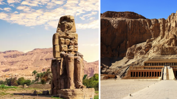 Les colosses de Memnon, uniques survivants du temple d'Aménophis III.